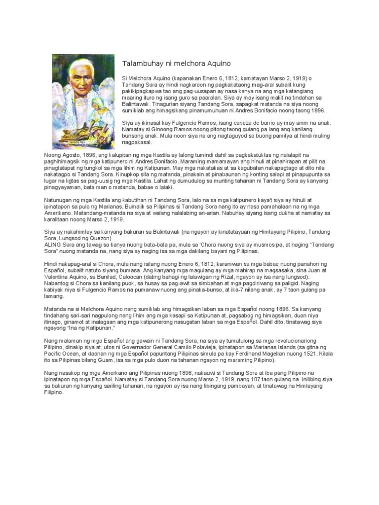 Melchora Aquino 6 Enero 18122 Marso 1919 Known as the Mother of the Philippine Revolution Binansagang Tandang Sora si Melchora Aquino Meltsóra Akíno bílang pagkilála sa kaniyang paglilingkod at pagkakanlong sa mga kababayan noong Himagsikang 1896 kahit na siyá ay nása katandaang gulang na. Answers Explanationseptember 61987hope it helps Ilang taon nang namatay si melchora aquino. Himagsikan 1896-1900 1.